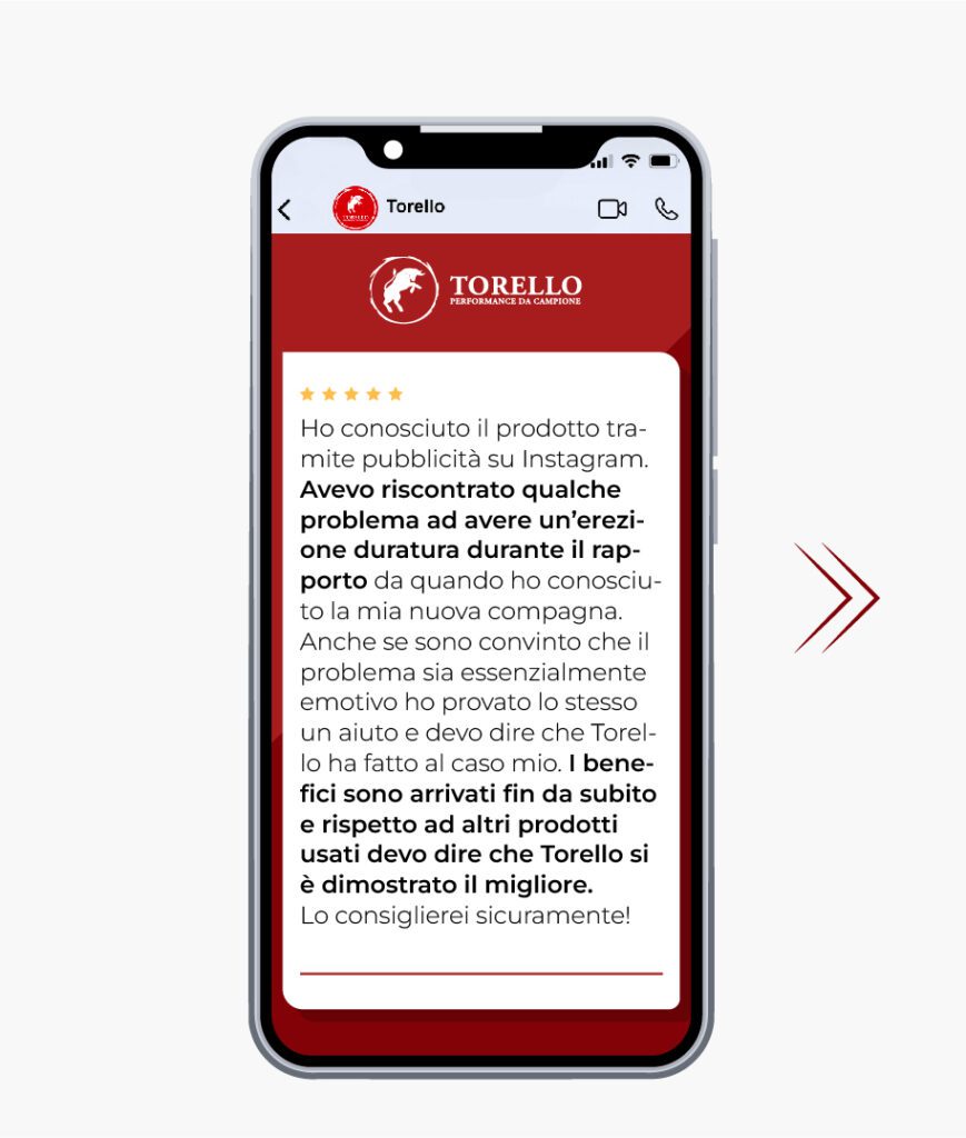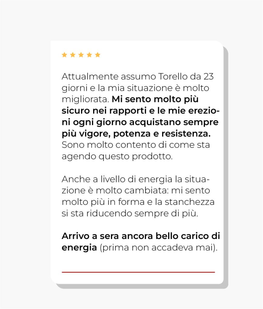 Secondo la più recente letteratura scientifica, Torello è il migliore alleato per riscoprire un’intimità bollente con la propria partner. Senza gli effetti collaterali e la schiavitù della “pillola blu”. Senza sprecare soldi in integratori con qualche milligrammo di vitamine e minerali, inutili per avere un’erezione.