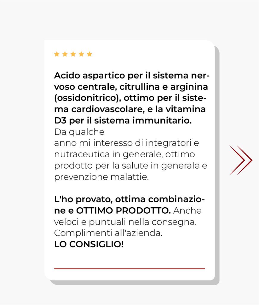 Acido aspartico e vitamina D3 per stimolare la produzione di testosterone, arginina, L-citrullina e folato per stimolare la vasodilatazione